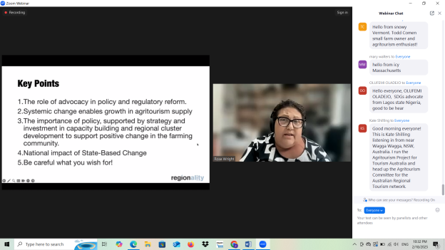 The webinar provided information on reforms that started a few years ago, with slow progress, but examples from Australia and pilot projects in New South Wales show that collaboration between farmer associations, tourism organizations, and the government is key to success, and it is important to build a clear legal framework that will enable the development of small agritourism businesses while maintaining farm productivity.